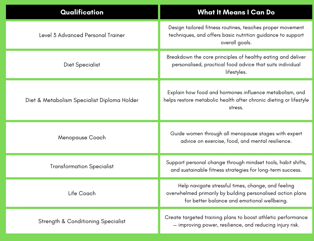 qualifications cover physical fitness, nutrition, mindset change, transformational change plus others, so that I can offer a complete solution that takes into account and